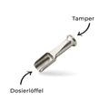 Schluss mit umständlichem Befüllen – der HIZEN Dosierlöffel mit Tamper vereint zwei essenzielle Werkzeuge in einem kompakten Tool aus chirurgischem Edelstahl (EN 1.4404).